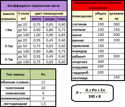 Wo? N - Die erforderliche Anzahl von Vorrichtungen; S ist der Deckenbereich; L - Erforderliche Anzahl der Suiten im Zimmer; P - Die Anzahl der Lumen, die von einer einzelnen LED-Glühbirne erzeugt werden.