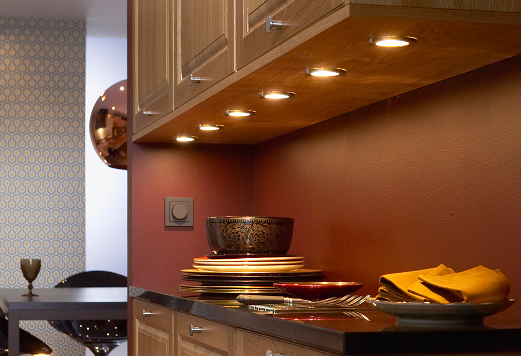 - In der Küche können Sie Grundformen kombinieren oder Raum gestalten. Legen Sie zum Beispiel einen Kreis über dem Essbereich und über der Arbeitsfläche der Küche einen Strahler an, um während des Kochens genügend Beleuchtung zu haben.