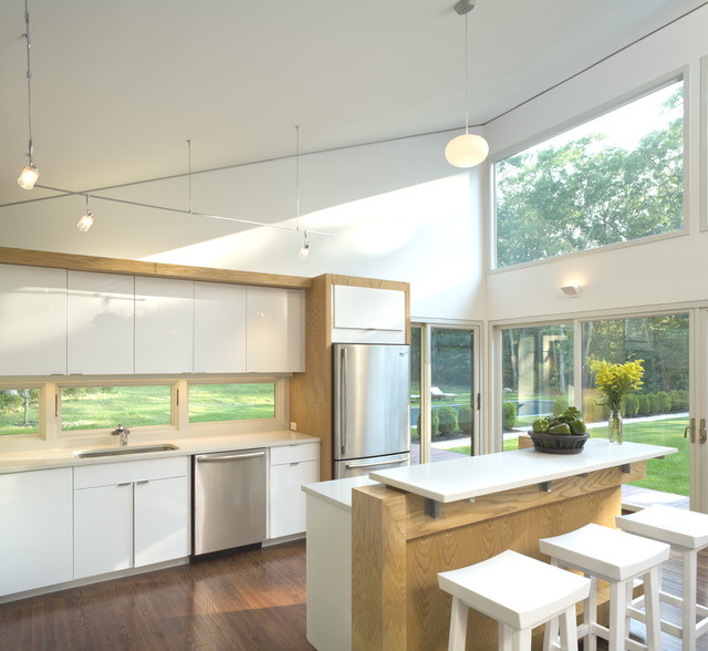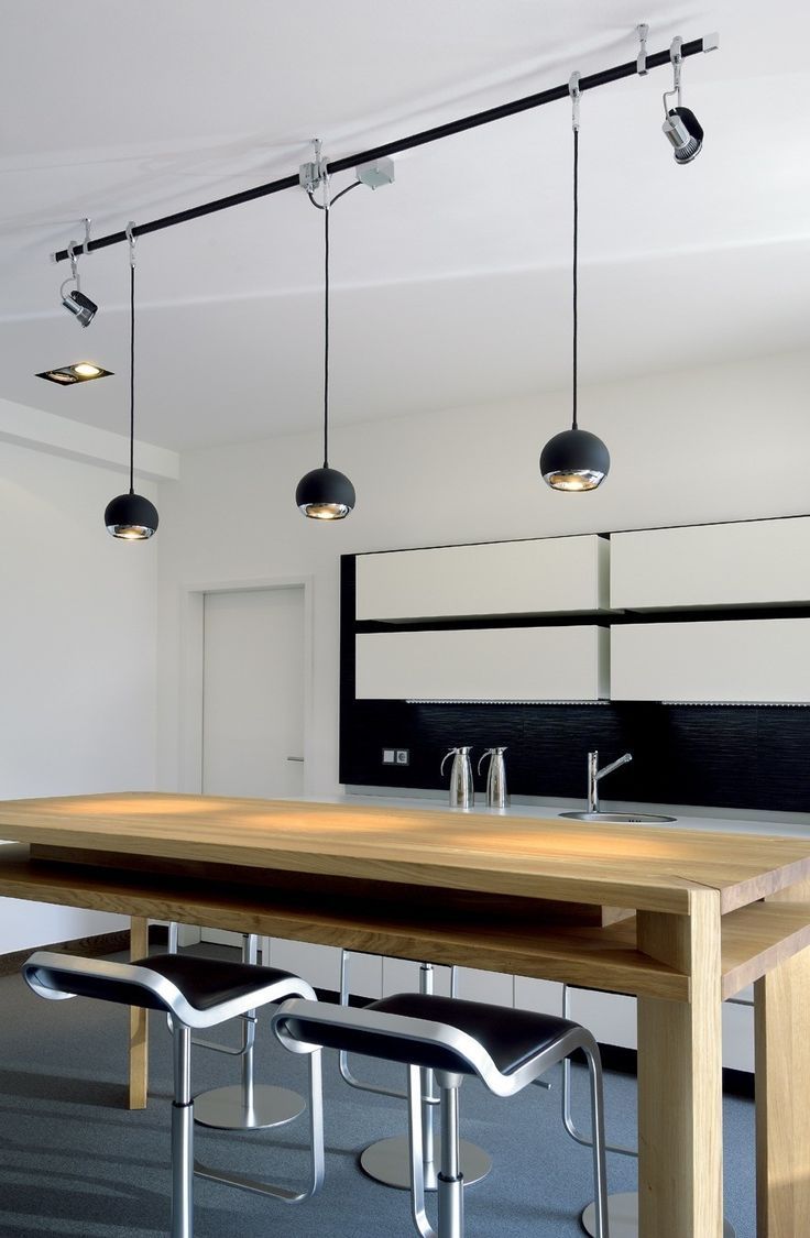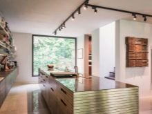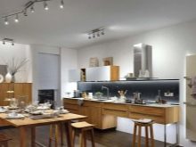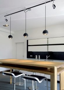 - Ein weiteres gutes Beispiel für den erfolgreichen Einsatz von Gleisleuchten an Kabeln in einer normalen Wohnung. Dank der doppelten Dekoration des Busses selbst mit diesen Geräten war es möglich, die perfekte Beleuchtung im Raum und vor allem auch sehr stilvoll zu schaffen. Mit seiner Hilfe war es hier möglich, den Raum optisch nach oben zu ziehen, um die Küche selbst ungewöhnlich, aber gleichzeitig gemütlich und zurückhaltend zu machen.