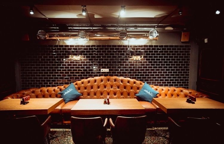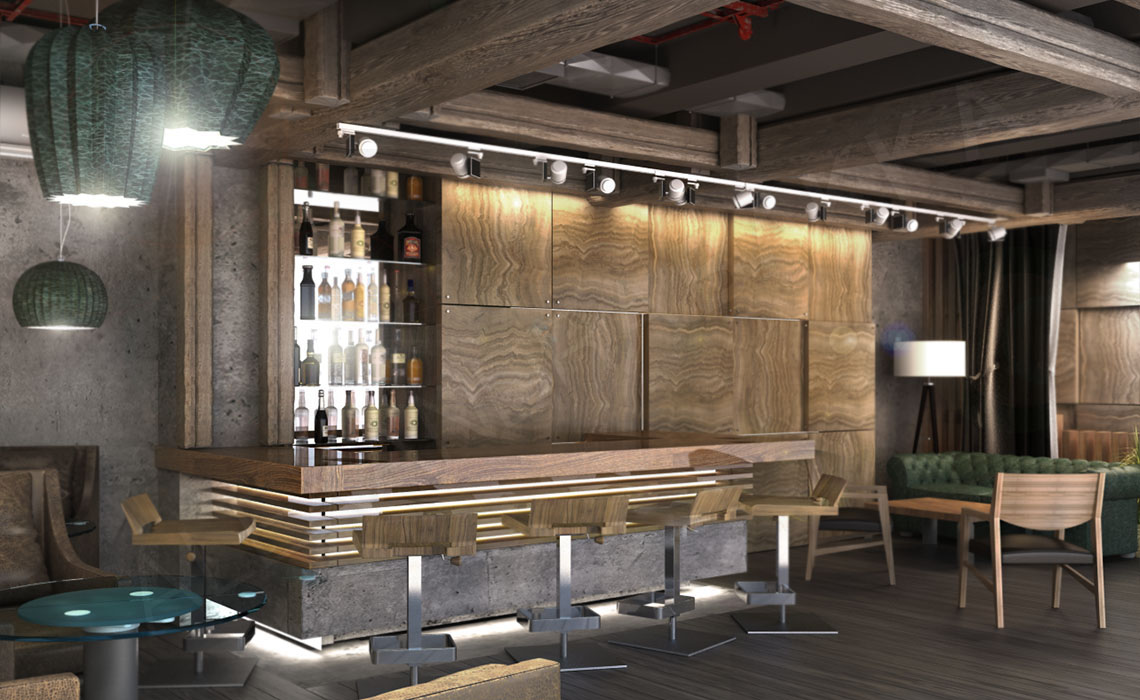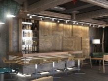 - Ein weiteres anschauliches Beispiel für den erfolgreichen Einsatz von Schienenbeleuchtung in der Bar. In diesem Fall befinden sich die Lampen an den Kabeln direkt über der Leiste.Sie ermöglichen Ihnen, das Menü sorgfältig zu untersuchen und sofort freien Speicherplatz hinter dem Zähler zuzuweisen. Aber bei all dem blenden sie nicht die Augen und lenken nicht von der Hauptsache ab.