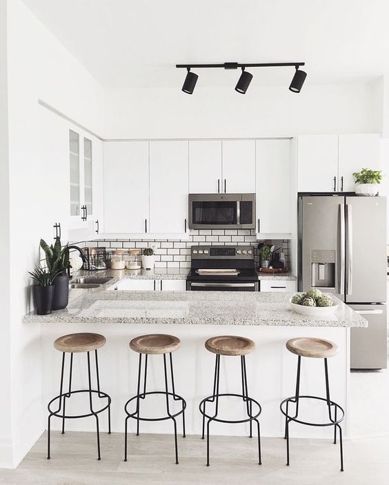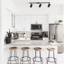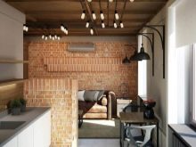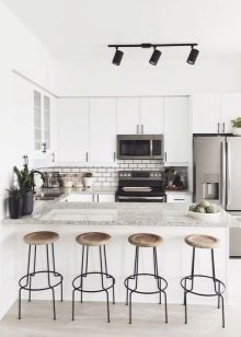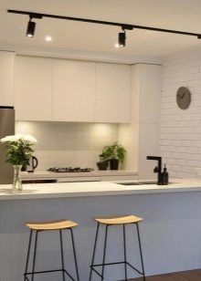 - Eine tolle Designoption für die Küchenbeleuchtung in einem kleinen Raum mit Bar. Schwarze Lampen heben sich vorteilhaft von der Lichtdecke ab und beleuchten sofort die drei Bereiche der Küche. Ihre Farbe erhöht visuell die Höhe des Raumes selbst, und der minimalistische Stil zieht einerseits Aufmerksamkeit auf sich und andererseits lenkt er nicht vom allgemeinen Inneren des Raumes ab.