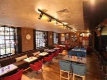 - Ein gutes Beispiel dafür, wie schön Lichter in Orten von Massenversammlungen von Menschen, in diesem Fall in einem Restaurant, verfolgen. Sie ermöglichen die effizienteste und korrekteste Beleuchtung aller Teile des Raums, während das Licht sorgfältig gestreut wird und den Besuchern keinerlei Annehmlichkeiten bietet. Gleichzeitig ermöglicht diese Art der Beleuchtung die Bereitstellung von freien Tischen für Kunden.