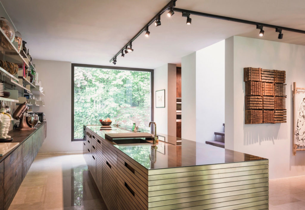 - Fans des beliebten Loft-Stils werden dieses Küchenlichtdesign sicherlich mögen. In diesem Fall sind die Gleislichter sehr gut gewählt, heben sie sich gleichzeitig im allgemeinen Innenraum des Raumes hervor und unterstreichen ihren Stil. Ihre exquisite Metallic-Farbe erregt sofort Aufmerksamkeit mit ihrer Einzigartigkeit, und dank der Tatsache, dass die Lampen einen Drehmechanismus haben, können Sie jederzeit den Winkel und die Intensität des Lichts ändern.