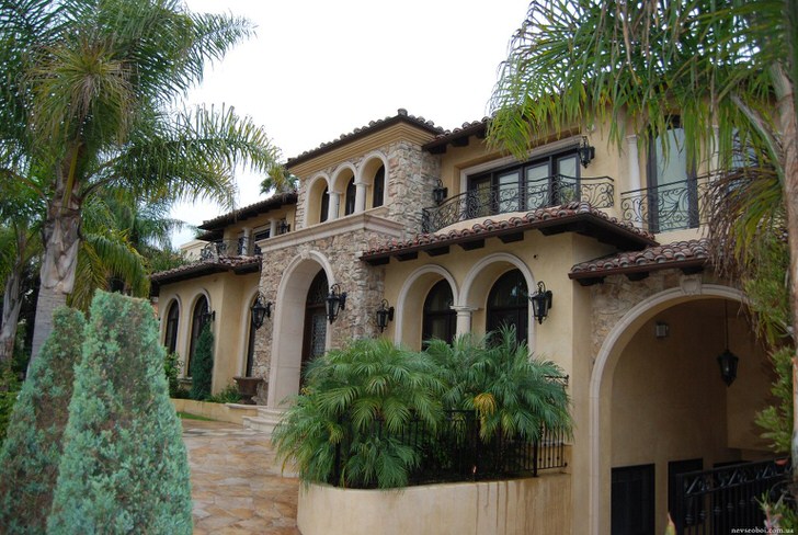 Häuser dekorieren Mediterraner Stil Es ist üblich, klassische Lichter an einer Stange zu verwenden. Sie sind perfekt mit dem insgesamt entspannten Stil kombiniert und schaffen nachts eine einzigartige, gemütliche und leicht rätselhafte Atmosphäre.Dank der Wahl von farbigem Glas (warme Farbtöne sind in der Regel bevorzugt, zum Beispiel gelb oder rot), ist die Beleuchtung leicht gedämpft, aber ausreichend. Es scheint, dass hier irgendwo ein Feuer brennt, und in einem solchen Hof fühlt sich eine Person vollkommen sicher.