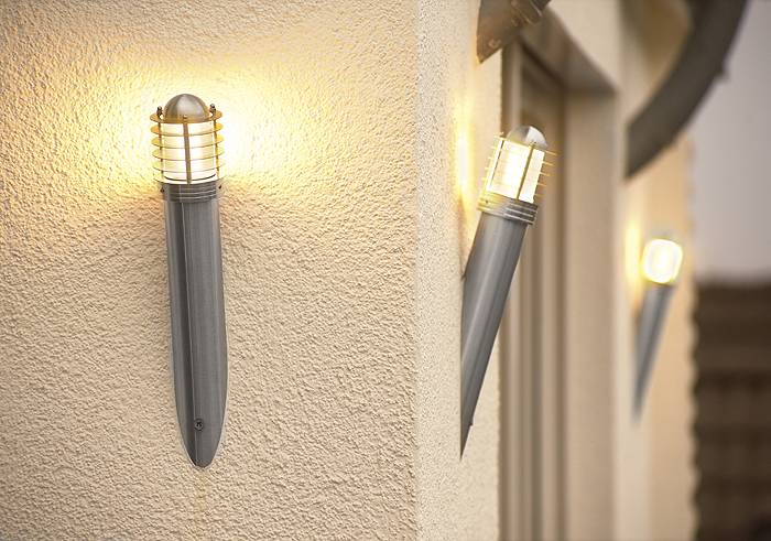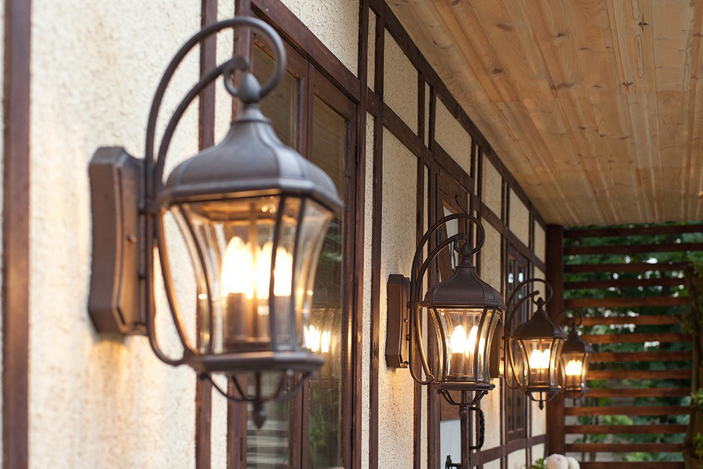 Wandleuchten können punktförmig oder gruppiert montiert werden, von denen die gesamte Wirkung des Designs abhängt. Eine große Anzahl von verschiedenen Instanzen ermöglicht es Ihnen, das Äußere des Hauses, in verschiedenen Stilen, vom funktionalen Minimalismus bis hin zum künstlerischen Barock zu gestalten.