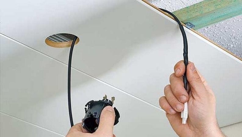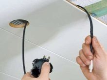 Um die Deckenleuchten anzuschließen, benötigen Sie ein Kabel mit einer Größe von 3x1,5 Quadratmetern. mm In diesem Fall, wenn die Verkabelung in einem Raum mit Feuchtigkeit durchgeführt wird, wird der Draht zunächst notwendig, das Wellrohr und eine Verbindung zum Verteilerplatte zu schützen, die sie hinter dem Gelände befinden werden.