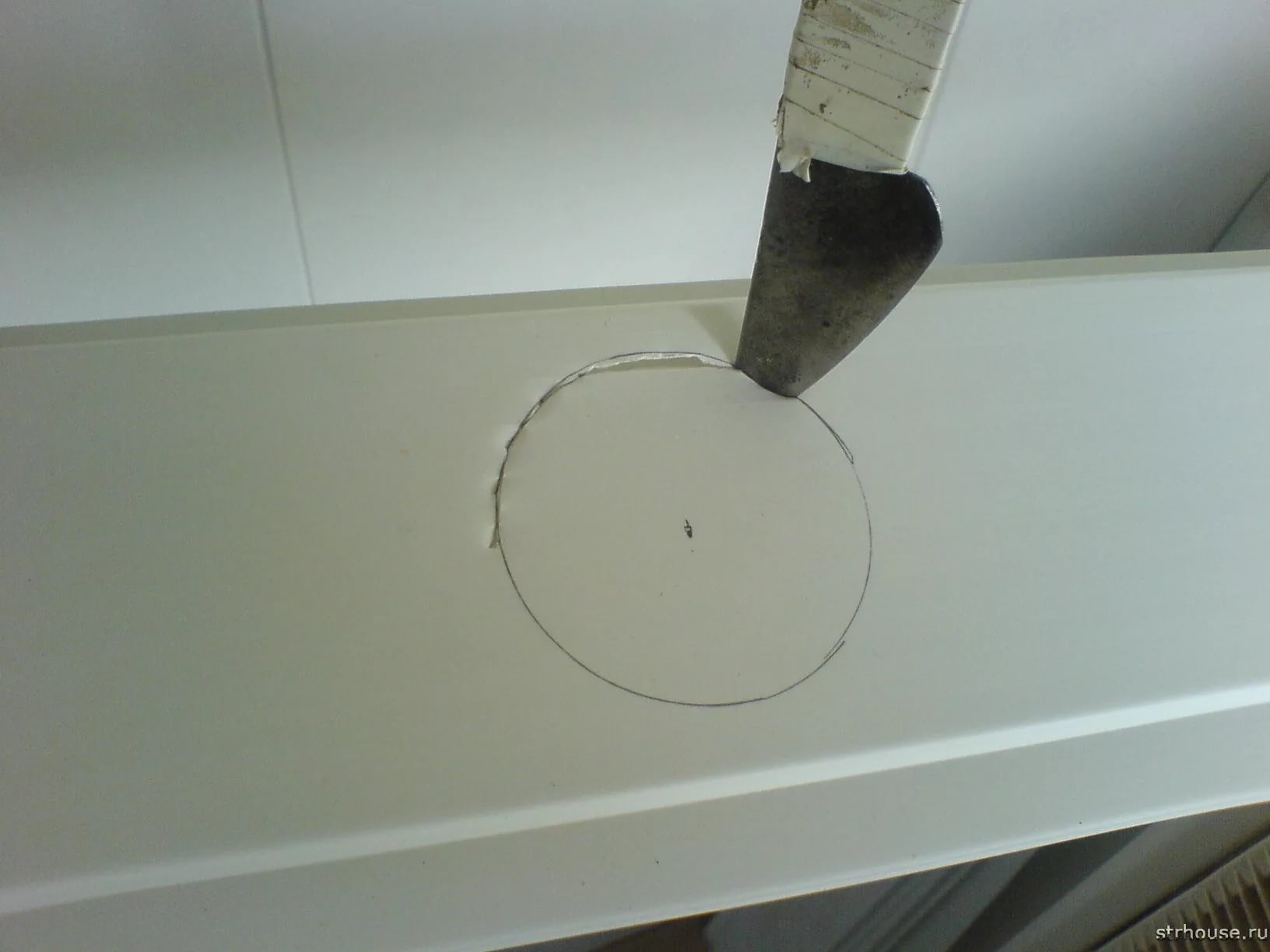 Um die Lampe in der Platte zu montieren war stark und zuverlässig, müssen Sie ein Loch bohren. Erstellen Sie zuvor ein Projekt, mit dem Sie die erforderliche Anzahl von Beleuchtungsgeräten und deren Standort berechnen können. Wählen Sie einen Ort und machen Sie einen Stiftumriss. Danach beginnt die partielle Abdeckung der Decke mit dem Material, die Installation des Standes und die Organisation der Löcher. Sie sollten mit einer speziellen Krone hergestellt werden, die für die Verarbeitung von Kunststoff- und Gipskartonplatten geeignet ist.Jetzt können Sie ein Loch schneiden, alle entstehenden Unregelmäßigkeiten müssen entfernt werden.