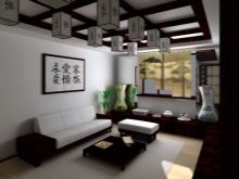 die Chinesisch und Japanisch Die Entwürfe verwenden stilisierte Papierlaternen, meist in Rot, sowie Bambuslampen. Diese Innenräume sind umweltfreundlich, so dass es natürlich ist, dass sie 100% natürliche Materialien und natürliches Licht verwenden. Sie sehen sehr charakteristisch und stilvoll aus. Der Gebrauch von modernen großen Kronleuchtern ist ein Tabu, es ist besser, mehrere kleine Lampen um den Umfang des Raumes zu legen.