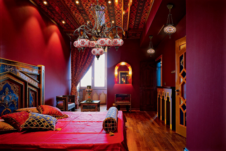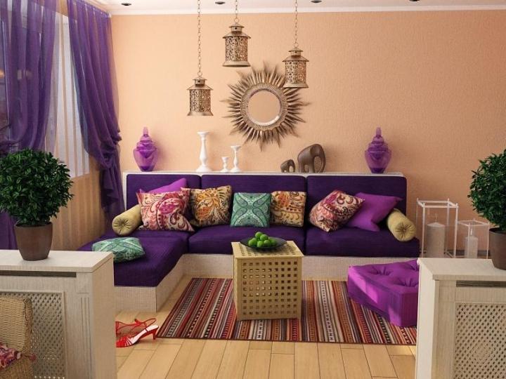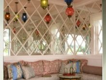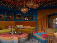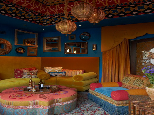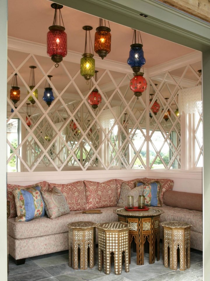 Marokkanisch und indisch Stil ist wesentlich luxuriöser Innenausstattung als die beiden genannten. Es verwendet reiche kurvige Vorhänge, teure ausgefallene Materialien und auffällige Ornamente. Besonders beliebt sind geschnitzte durchbrochene Kronleuchter im arabischen Osten, die ein mysteriös anmutendes Licht in den Raum werfen. Glasmalerei kann verwendet werden.Diese Lichtquellen können definitionsgemäß nicht hell sein, daher herrscht mysteriöse Dämmerung im Raum.