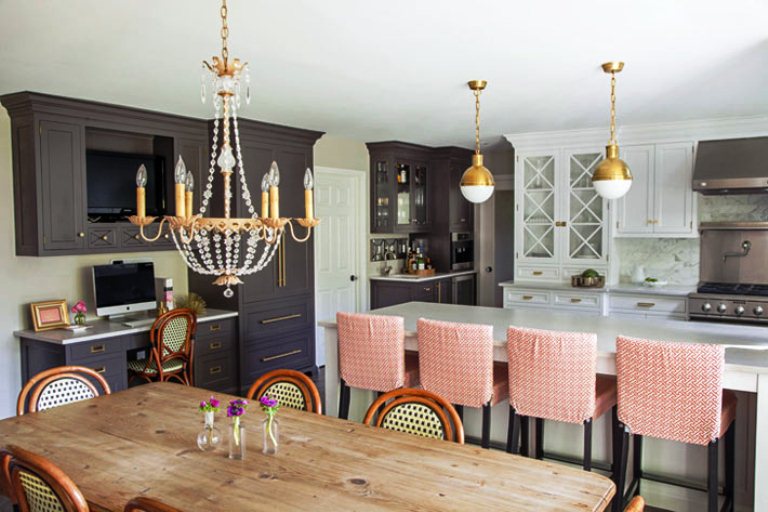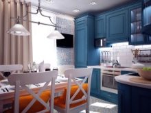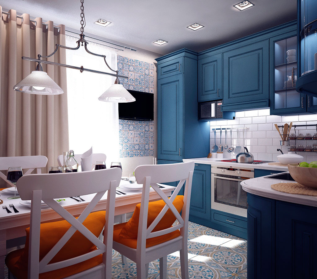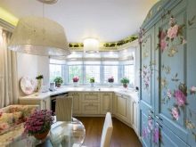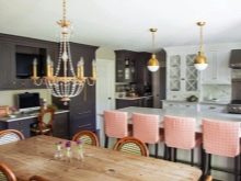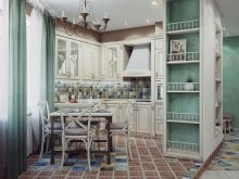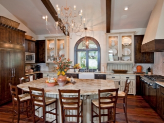 Anspruchsvoller und strebender nach den Klassikern ist Italienischer mediterraner Stil. Es verwendet oft eine Kombination aus Nuss- und Olivenblüten, Grün- und Pflanzenmotiven. Möbel mit Locken sind aus natürlichem Holz oder Rattan gefertigt, so hohe Barhocker. In einem solchen Innenraum wird häufig Polsterung aus Naturtextilien verwendet. Hier können Sie mit vergoldeten oder Messing-Kronleuchtern mit auffälligen Lampenschirmen experimentieren, massiv geschmiedete Produkte aus dunklem Metall sind angebracht.