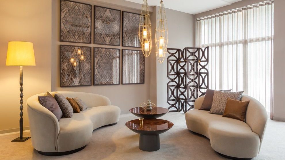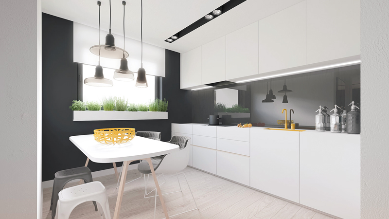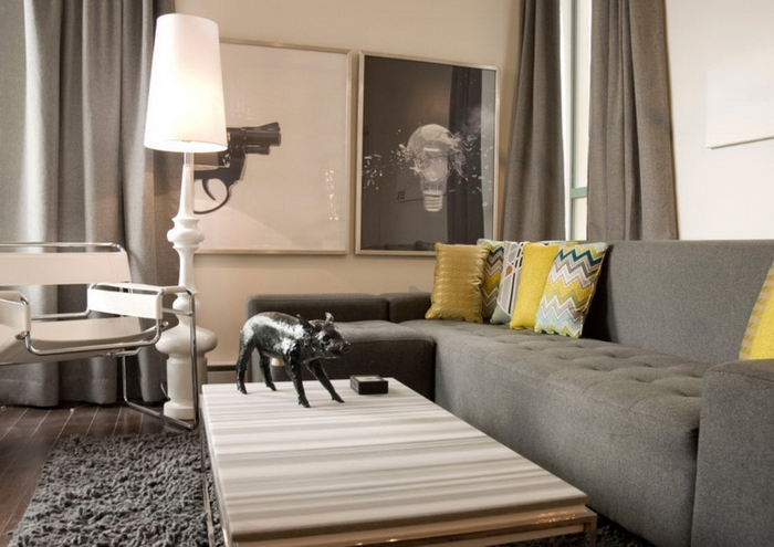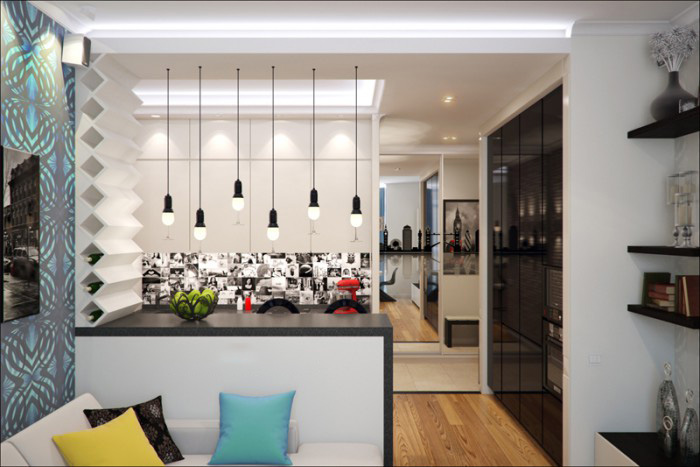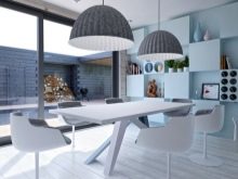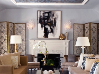 Wenn andere Modelle wie Stehlampen oder Kronleuchter verwendet werden, können Sie einen hellen Farbakzent setzen. Vergessen Sie auch nicht, dass Chrom-Accessoires perfekt für diesen Stil sind.
