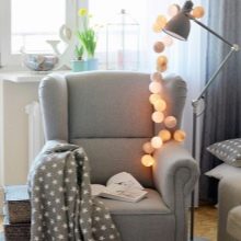 - "Wattebällchen" - eine Art Girlande aus LED-Lampen, die im Raum verstreut sind. Sie haben nicht viel Licht, aber sie geben dem zurückhaltenden skandinavischen Design Wärme.