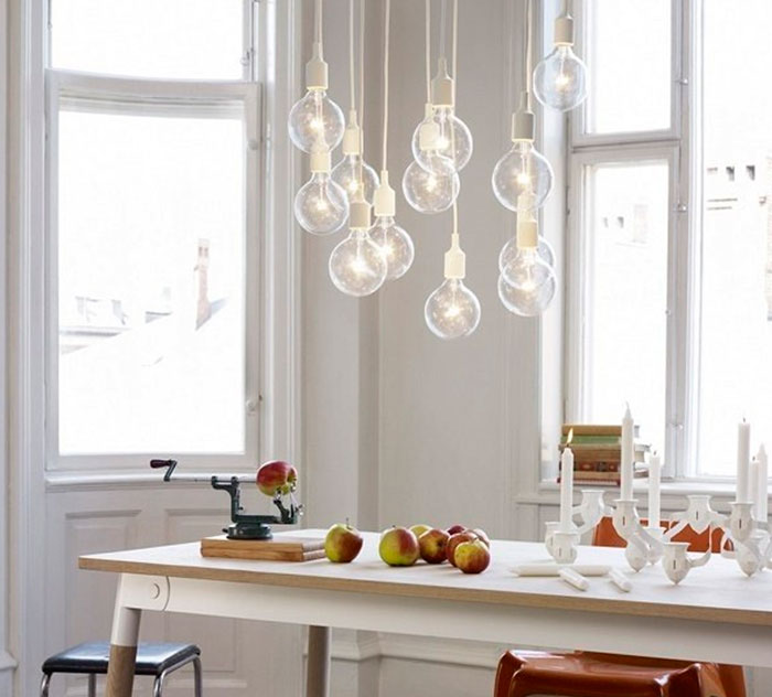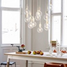 - Ein paar Edison-Birnen über der Bar ergänzen das skandinavische Interieur perfekt. Im modernen Design ist es immer vorzuziehen, mehrere Lichtquellen als eine, aber große zu verwenden, und Skandinavien in diesem Sinne folgt den neuesten Trends.