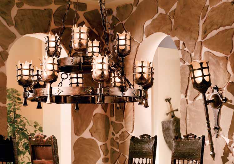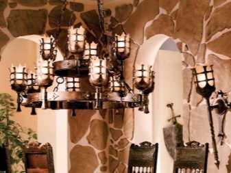 - Massive gotische Lampe, geeignet für geräumige Räume mit hohen Decken. Es ist am besten, im Wohnzimmer zu haben und das entsprechende geschmiedete Zubehör zu unterstützen.