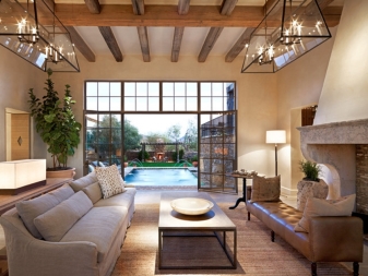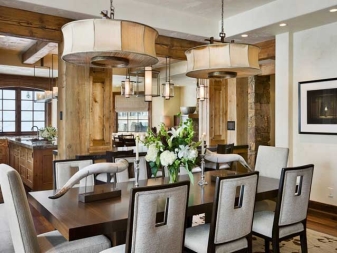 Da das charakteristische Merkmal dieses Stils massive Deckenbalken sind, ist es sinnvoll, mehrere lokale Leuchten zu kaufen, die weiches Licht abgeben und sie im Raum anordnen. Sie können Tischlampen mit Lampenschirmen oder Stehlampen sein. Dank der großen Fenster wird genug Licht im Raum sein.
