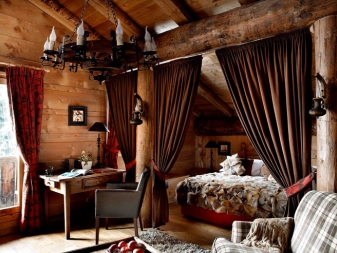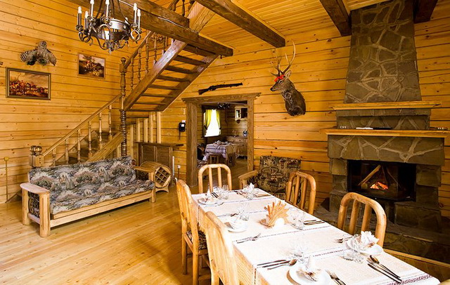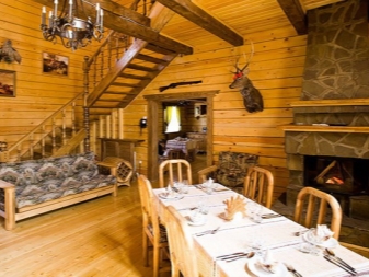 Haus in Jagd Stil - eine mutige Entscheidung, aber es ist voll gerechtfertigt durch seinen Komfort und Bequemlichkeit. Das Interieur verwendet nur natürliche Materialien. Meistens sind die Wände aus Holz oder mit Holz verkleidet. Naturstein kann auch verwendet werden. Die gleichen Texturen werden verwendet, um den Boden zu dekorieren.