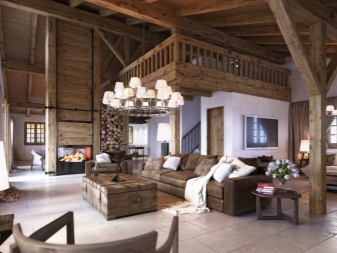 Ein solches Haus hat traditionell hohe Decken, so dass hier große Kronleuchter-Kronleuchter angebracht sind. Lampen in Form von Kerzen geben dem Innenraum Harmonie, solange das Licht warm und weich ist. Diese Lampe wird perfekt mit dem Kamin kombiniert.