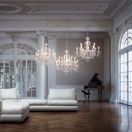 Daher sind für Innenräume in diesem Stil mehrstufige Kristallkronleuchter mit vielen Glühbirnen und Anhängern ein Muss. Sie können das Interieur mit eleganten Wandlampen im gleichen Stil aus antikem Schmiedeeisen ergänzen.