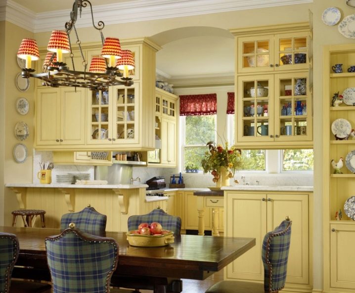 Landhausstil Es ist sehr ähnlich wie die Provence, aber es stammt aus Amerika und hat eine Reihe von Funktionen. Zum Beispiel ist das gebräuchlichste Textilmuster eine charakteristische Zweitonzelle, die auch für Lampenschirme verwendet werden kann. Die Möbel und das Dekor dieses Stils sind einfach, gut gemacht, aus natürlichen Materialien hergestellt.