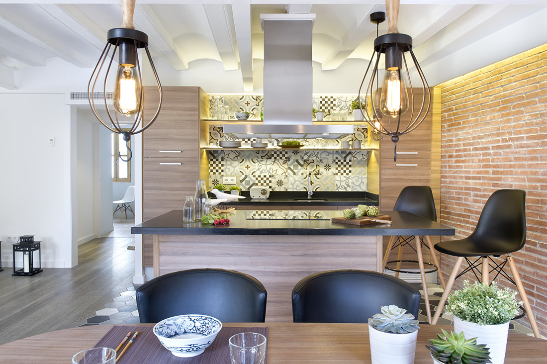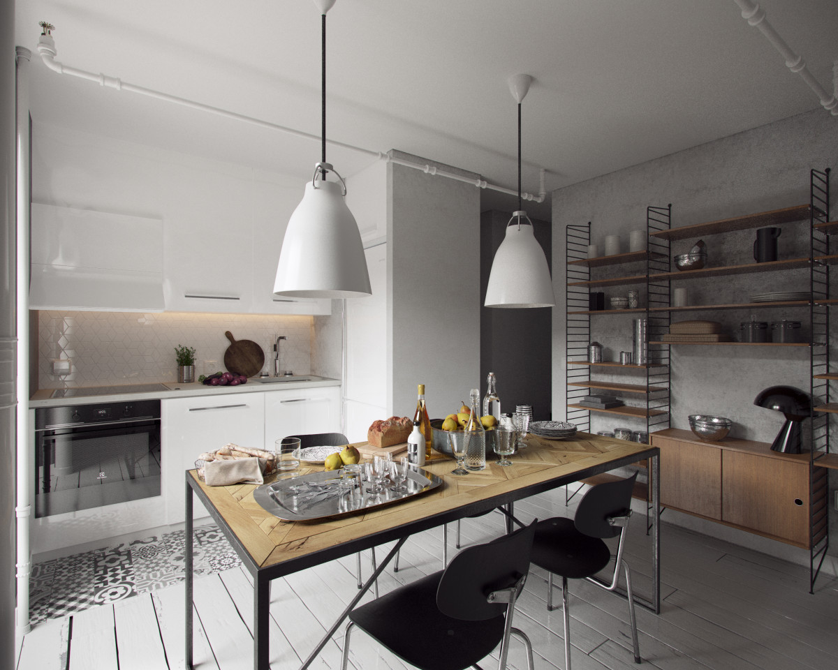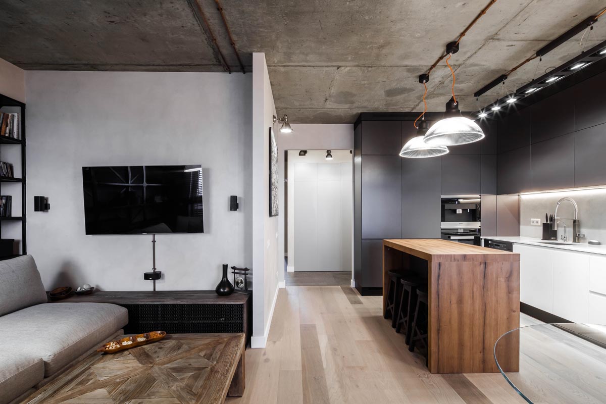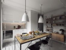 Option Design Küche in einem Landhaus. Raue Betondecke, perfekt ergänzt mit brutalen lakonischen Schwarzlampen. Loft-Stil ist die einzige Design-Option für einen Raum, in dem die Decke nicht maskiert werden muss. Eine solche Küche kann mit Objekten unterschiedlicher Größe hergestellt werden, und es wird nicht fehl am Platz aussehen.