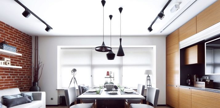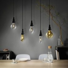 Der einfachste Loft-Effekt in der Beleuchtung ist eine Handvoll Retro-Glühbirnen, an langen Drähten an der Decke aufgehängt, auf eine solche Lampe kann man eine Glasdecke legen. Deckenglas kann in der Form unterschiedlich sein. Die Aufhängung an der Kette wirkt nicht nur brutal, sondern auch funktional, denn die Decke ist ziemlich massiv. Typische Loft-Modelle sind eine Kombination aus einer schwarzen Decke in verschiedenen Formen mit einer Retro-Lampe.