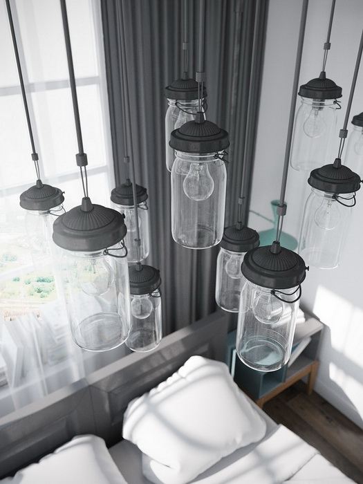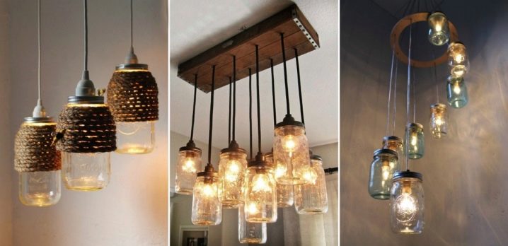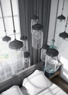 Eine Trend-Loft-Version kann mit einer Glasdose und Retro-Glühbirnen erstellt werden. Um dies zu tun, müssen Sie an eine Halterung für die Glühbirne mit einer Patrone in der Decke denken.