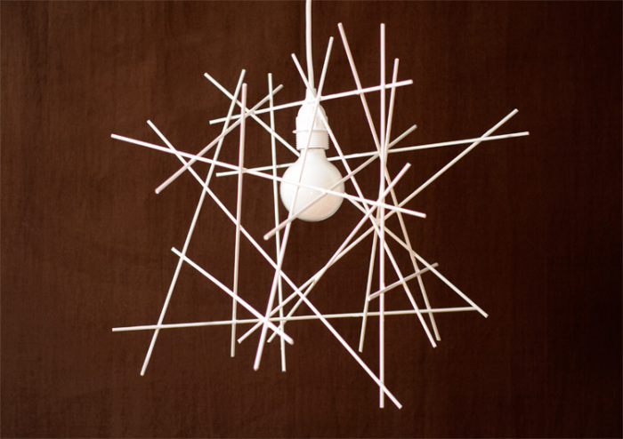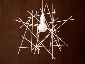 Nachdem Sie gelernt haben, ein Design aus Stöcken mit Ihren eigenen Händen zu machen, können Sie das Design in Form eines Drahtes, einer Patrone und einer Retro-Lampe mit einem Rahmen verbinden und ein Designerprodukt erhalten. Grillstangen müssen zusammen geklebt werden und dann in der gewünschten Farbe aus dem Zylinder lackiert werden. Die leichte Abdeckung sitzt perfekt auf der Patrone und sieht sehr stilvoll aus.