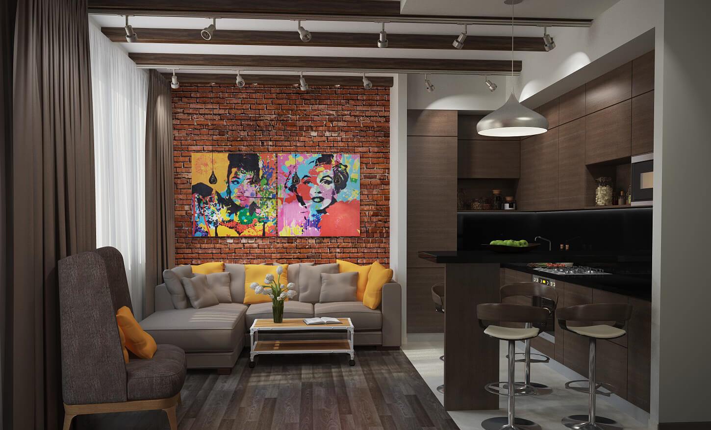 Sie können die Kombination der brutalen Noten des Inneren schätzen: antike Sessel und grobe Lampen ergänzen sich. Das helle Design des Fotostudios schickt uns in die 40er Jahre, die Kombination aus Strahlern, Reproduktionen von Andy Warhol und einem stromlinienförmigen, grauen Baldachin sieht toll aus mit einem matten Laminat. Luftige Glasballons mit LEDs passen sich in leuchtenden Farben perfekt an den Innenraum an, der Schatten des Fußbodens passt zum Sofa und der Teppich wird mit Mauerwerk kombiniert. Die Decke scheint aufgrund mehrerer sphärischer Farbtöne höher zu sein.
