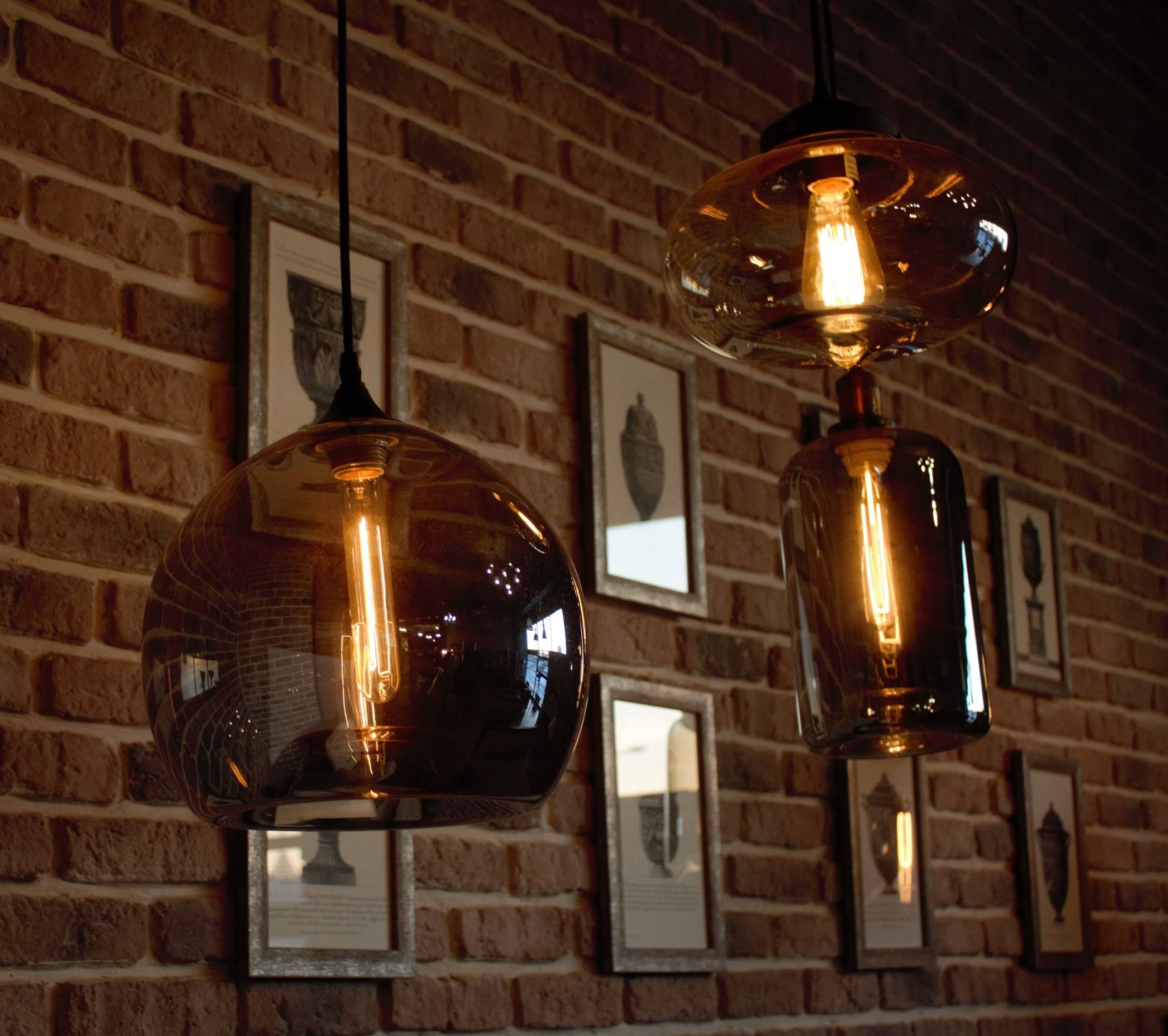 - Wenn die Wand bunt und uneben ist, zum Beispiel interessantes Mauerwerk oder Holzplatten im Vintage-Stil, dann sehen Glas- und Drahthellampen vor diesem Hintergrund am besten aus. An der Wand können Sie Bilder aufhängen und ein Element wird durch das andere sichtbar, wodurch eine visuelle Schichtung entsteht.