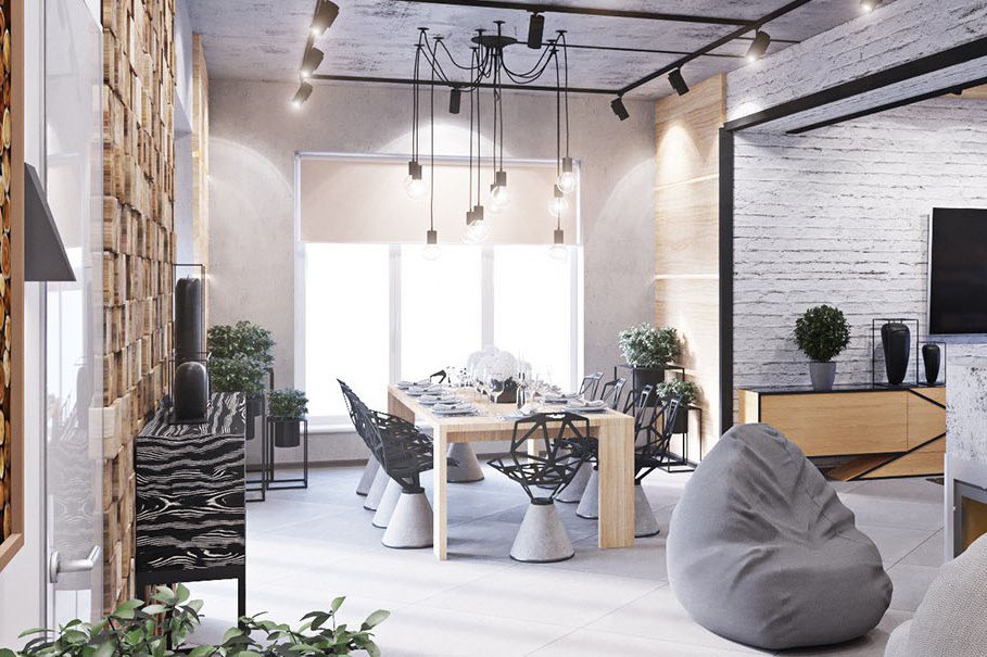 Hängelampen an den Kabeln stellen ein visuelles Volumen des Raumes dar. Das Wohnzimmer ist voll von Objekten unterschiedlicher Größe, die ihm eine Fülle geben. Mehrere Lampen in Form einer Halbkugel, Hauben und Platten verleihen dem Raum Tiefe.