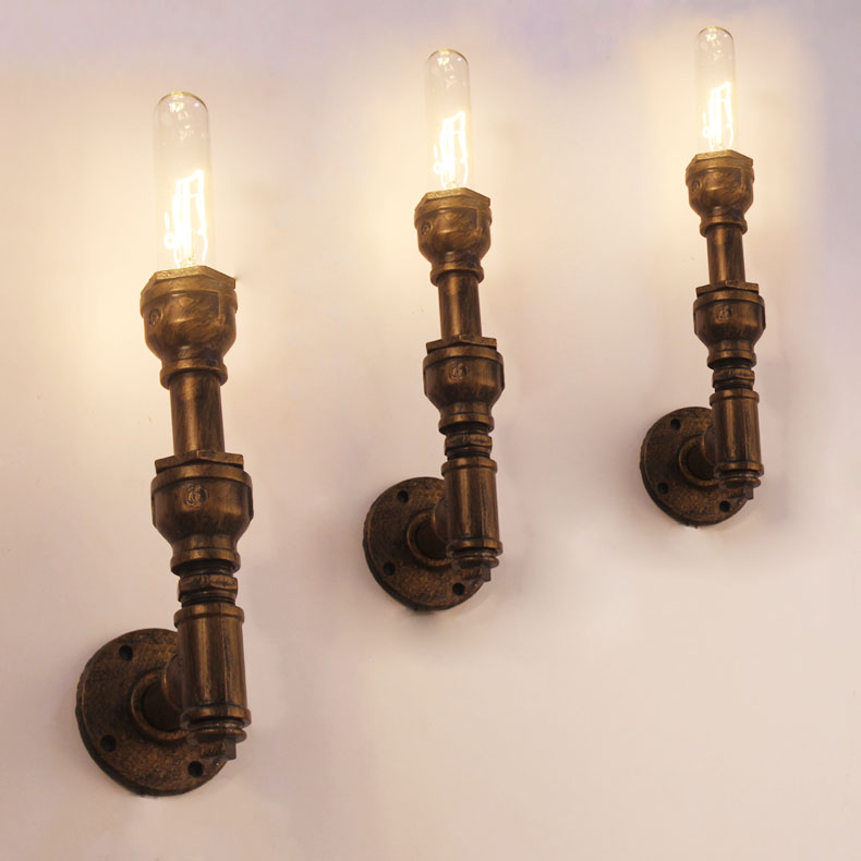 - Wandlampen aus Rohren montiert. Mehrere Varianten von Wandleuchten aus Rohren sind Symbole des Loft-Uhrwerks: eine Wandleuchte in Form einer Batterie und eine Wandlampe eine Kerze aus Kupferrohren.