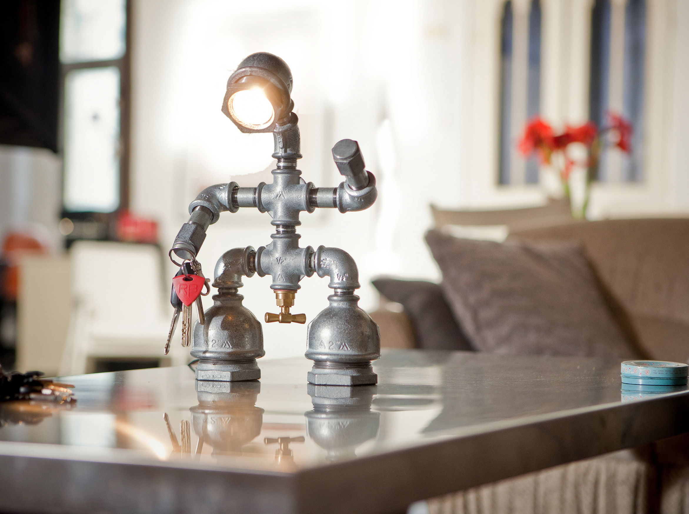 - Designermodelle - Dies ist eine kreative Lösung für industrielle Motive: Das städtische Thema ist der Geist des "Loft" -Stils und das Symbol der Urbanisierung ist der Roboter. Die roboterförmige Benchtop-Leuchte besteht aus Rohren."Roboter" kann mit einem "Kopf" in Form einer Glühbirne oder mit einer Kappe sein. Die ursprüngliche Lösung für Unterhaltungseinrichtungen, die in einem industriellen Thema entworfen wurde, kann eine Beleuchtungsvorrichtung sein, die aus Glühbirnen und Rohren in Form eines Pfeils montiert ist und die Funktion eines Bücherregals erfüllt. Ein solches Gerät ist besser am Gang von einem Raum zum anderen zu installieren.