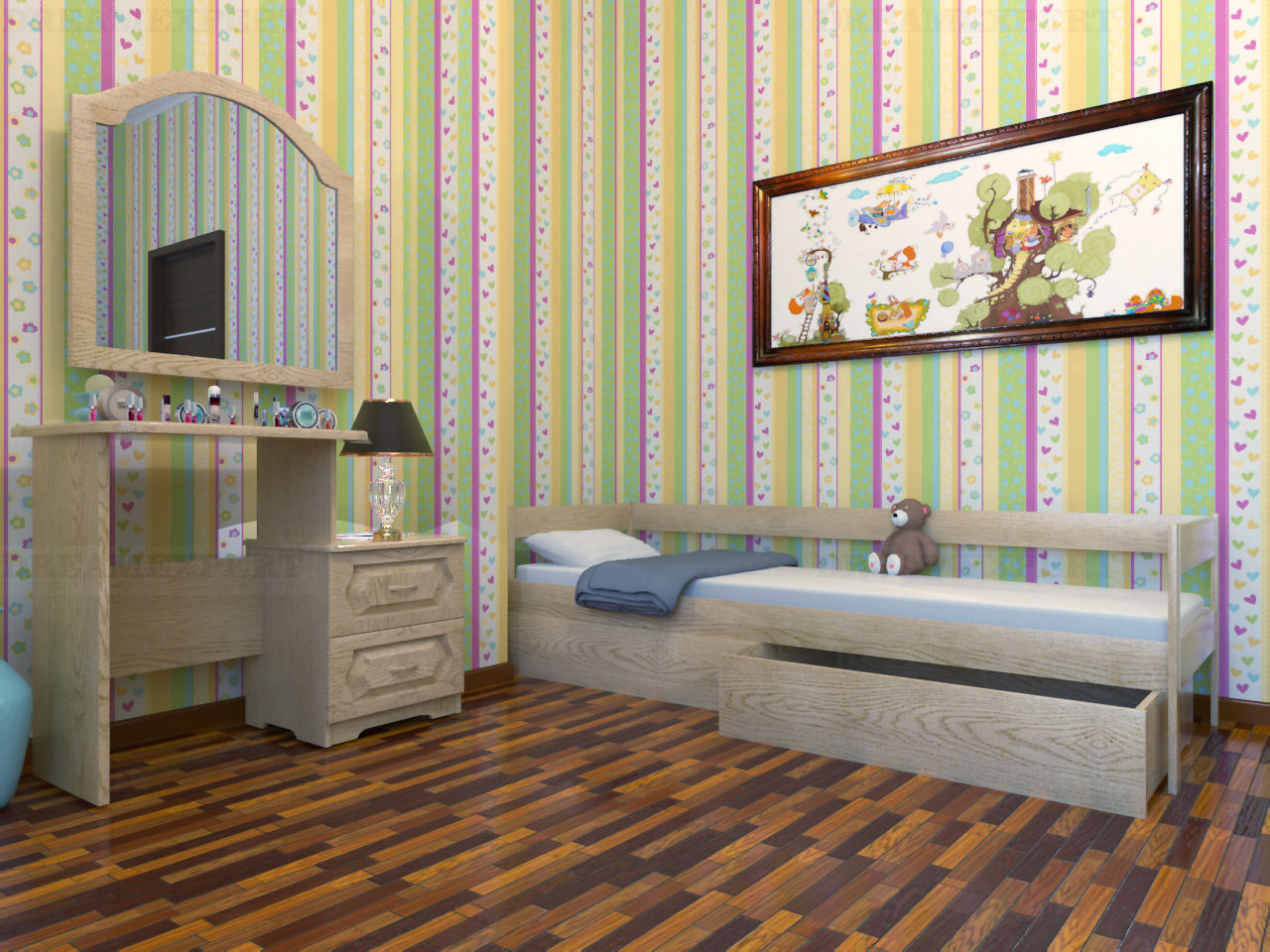 Diese Optionen sind stilvolle Möbel, die mit den lebendigsten Drucken verziert werden können. So können Sie die Individualität Ihres Kindes ausdrücken und den Stil des Raumes beobachten.