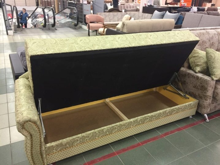 Was den Grundfüller betrifft, kann es Polyurethanschaum sein. Modelle mit Schubladen für Wäsche helfen, Bettwäsche bequem zu lagern. Wenn Sie also das Sofa entfernen, haben Sie keine Frage, was Sie mit Kissen oder Decken machen sollen. Was die Mechanismen einer einzelnen Ottomane betrifft, können sie von den folgenden Typen sein: