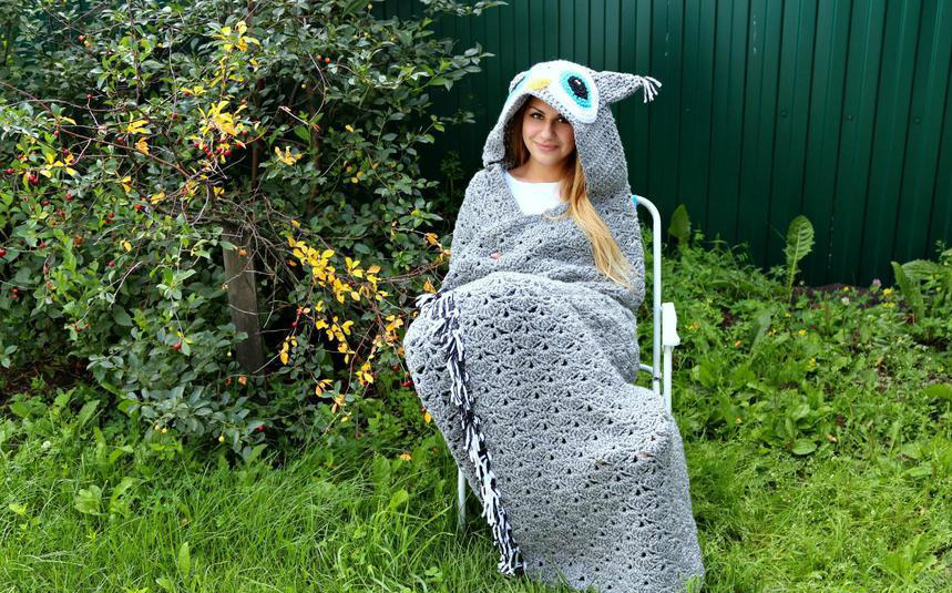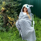 - Mit einer Kapuze. Hooded Decke ist ein charmantes und sehr komfortables Produkt. Üblicherweise handelt es sich um Kindermodelle, obwohl einige Hersteller auch erwachsene Käufer mit solchen Neuheiten begeistern. Plaid mit Kapuze ist unentbehrlich für Tiefgang und niedrige Temperaturen im Raum.Und nach dem Duschen kann er einen Bademantel ersetzen und seinen Kopf mit nassen Haaren bedecken, bevor er trocknet.