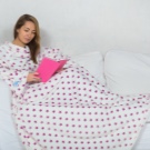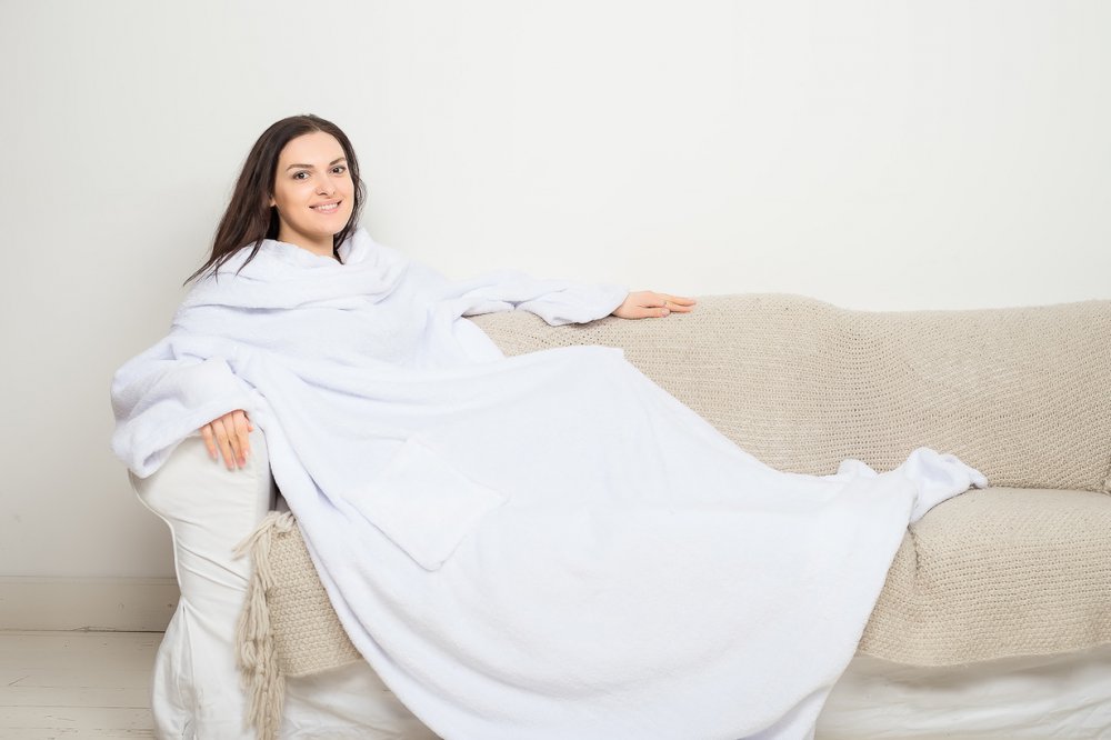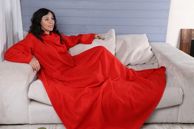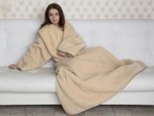- Bequemlichkeit. Anders als ein gewöhnlicher Morgenmantel bedeckt ein solcher Umhang den ganzen Körper einschließlich der Beine. Das Eindringen von kalter Luft ist ausgeschlossen. Darüber hinaus ist die Decke mit Ärmeln sehr geräumig. Es erlaubt Ihnen, in jeder Position zu sitzen und zu liegen, ganz ohne einschränkende Bewegungen. Es wird in einer schnellen Bewegung angelegt und entfernt.