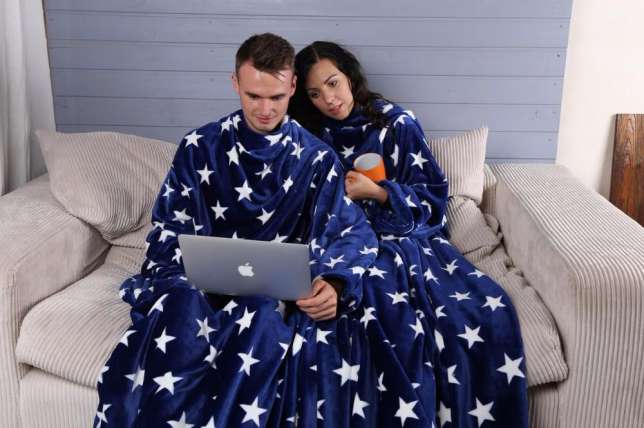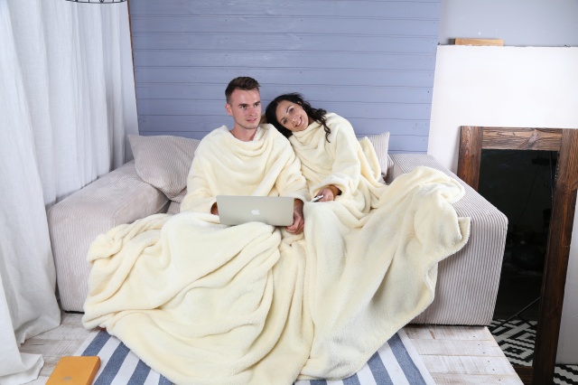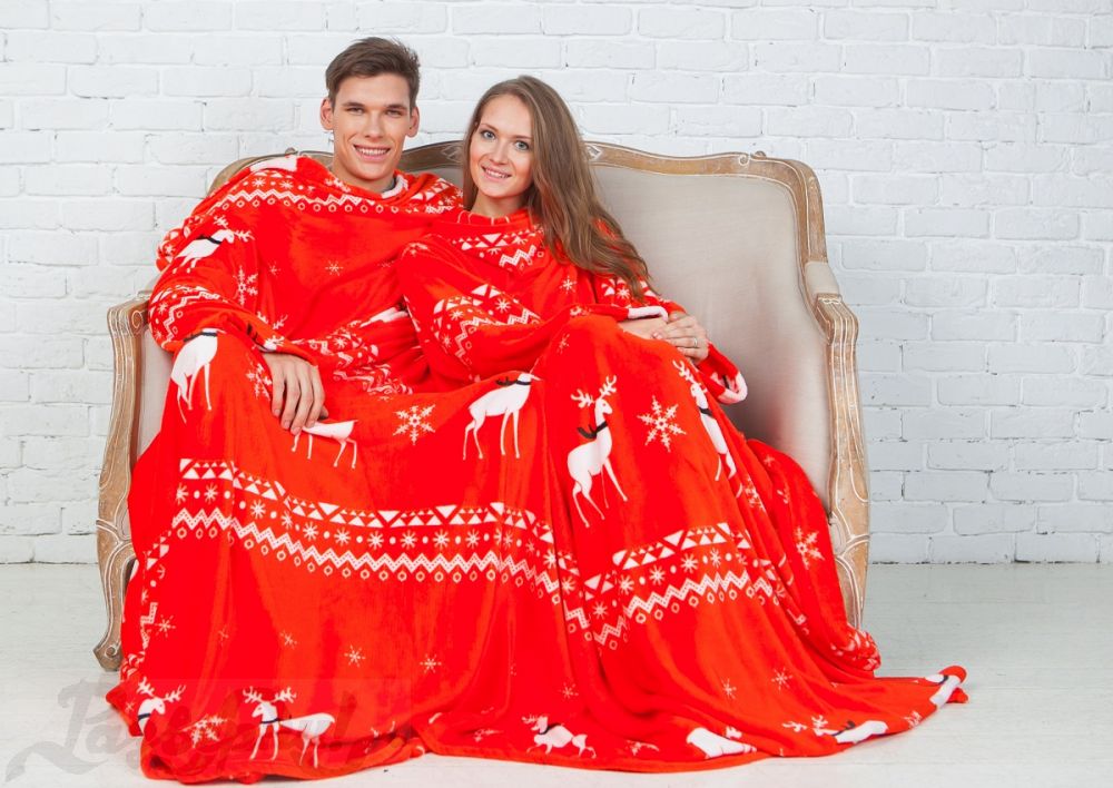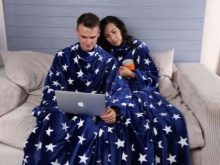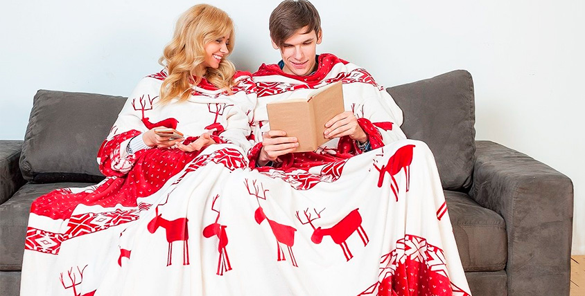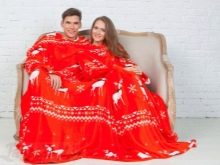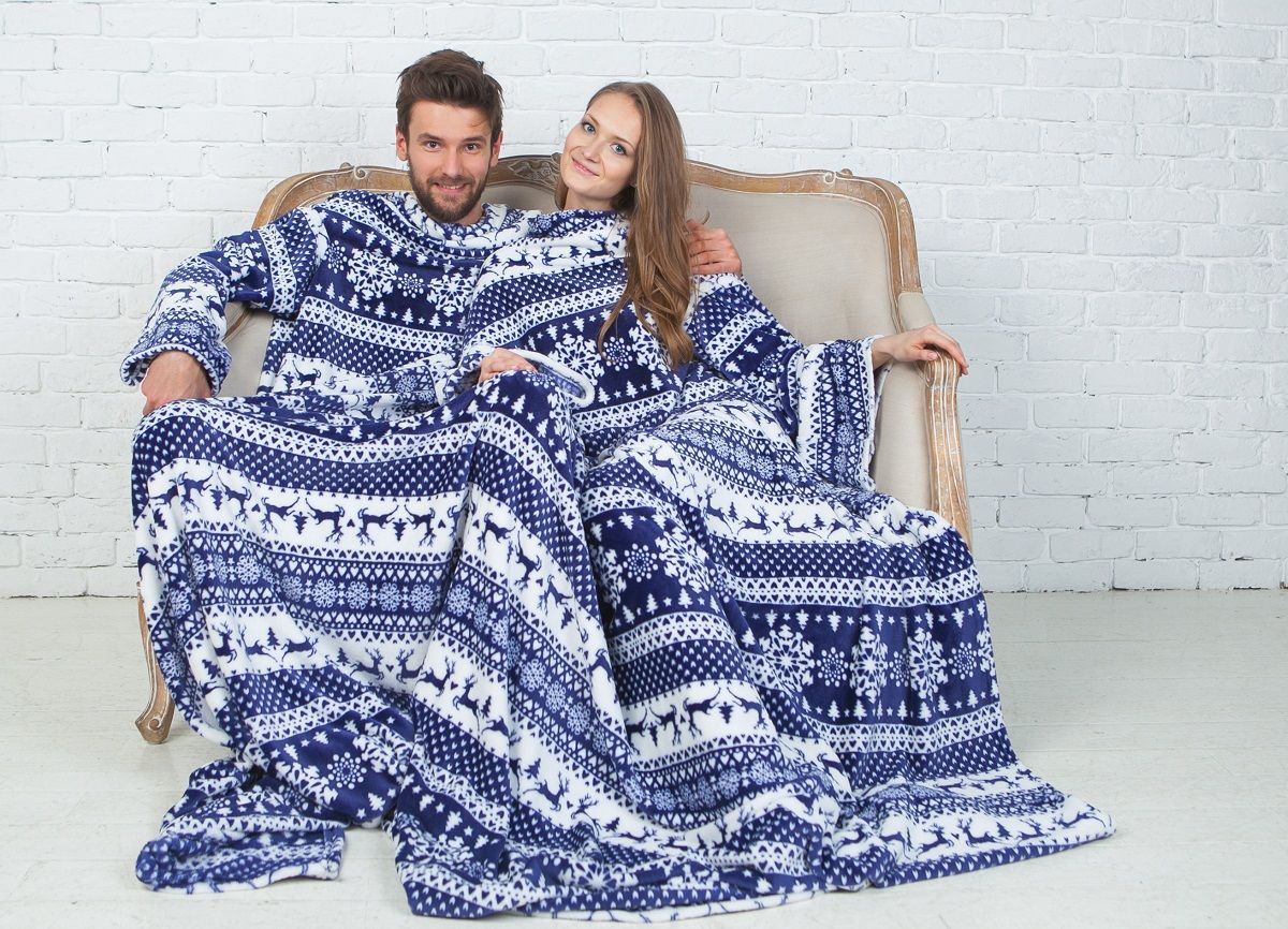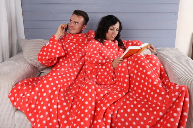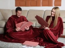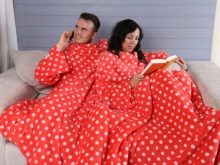 - Für zwei. Sehr beliebte Optionen für Paare. Eine Decke mit Ärmeln für zwei Personen wird sich in ihren weichen Umarmungen von Liebhabern erwärmen, die gerne die Abende zusammen verbringen. In solch einem Produkt zu sein, können Sie Ihren Lieblingsfilm anschauen oder einfach nur von Herz zu Herz reden.