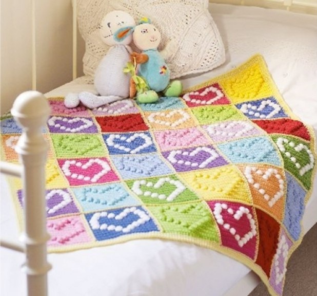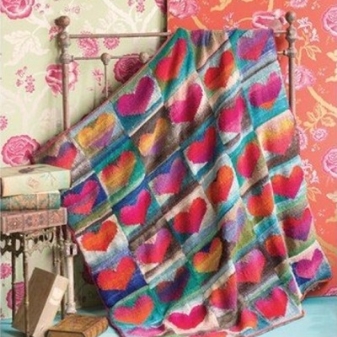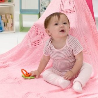 Ein bedeutender Teil der jungen Hausfrauen, bereits bestehende oder noch sehr junge Mütter wählen oft eine Herzform als Muster für eine Tagesdecke oder einen Teppich. Nach den meisten Bewertungen ist es dieses Muster, das Kinder besser wärmt, schützt und beruhigt. In diesem Fall sind die Kinder am ehesten in monophone Decken oder Windeln eingewickelt, die aus warmen, großen Fäden genäht oder gestrickt sind.