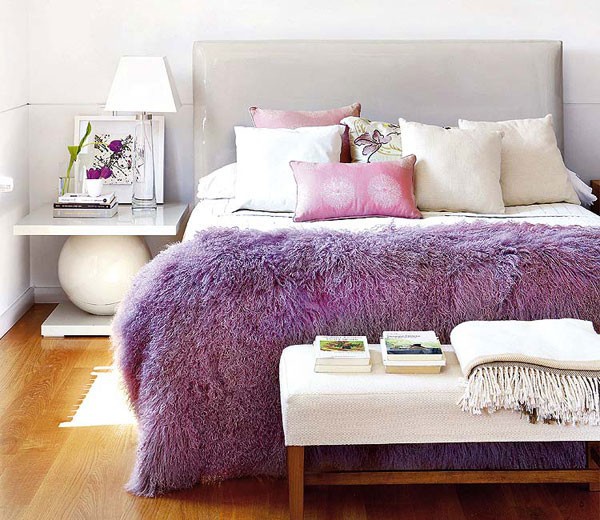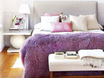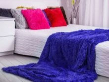 Im modernen Design können völlig unterschiedliche Texturen, Formen, Farben und Drucke nebeneinander bestehen, so dass für flauschige Tagesdecken keine besonderen Farbeinschränkungen gelten. Die Hauptbedingung ist, dass eine weiche "Plaid" -Wolke mit dem Farbschema des gesamten Innenraums übereinstimmen oder diese ergänzen muss.