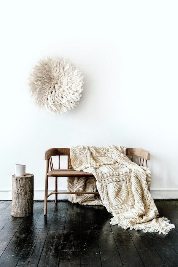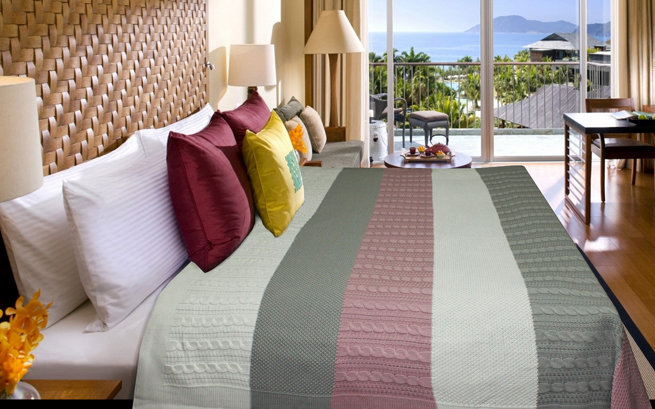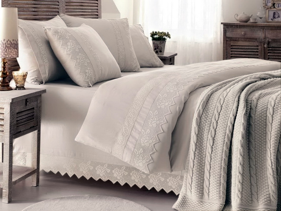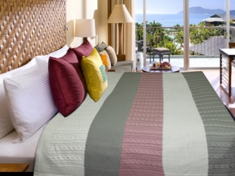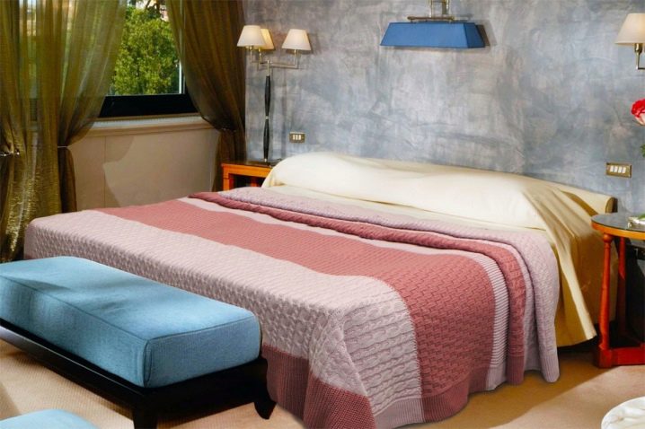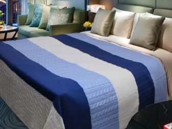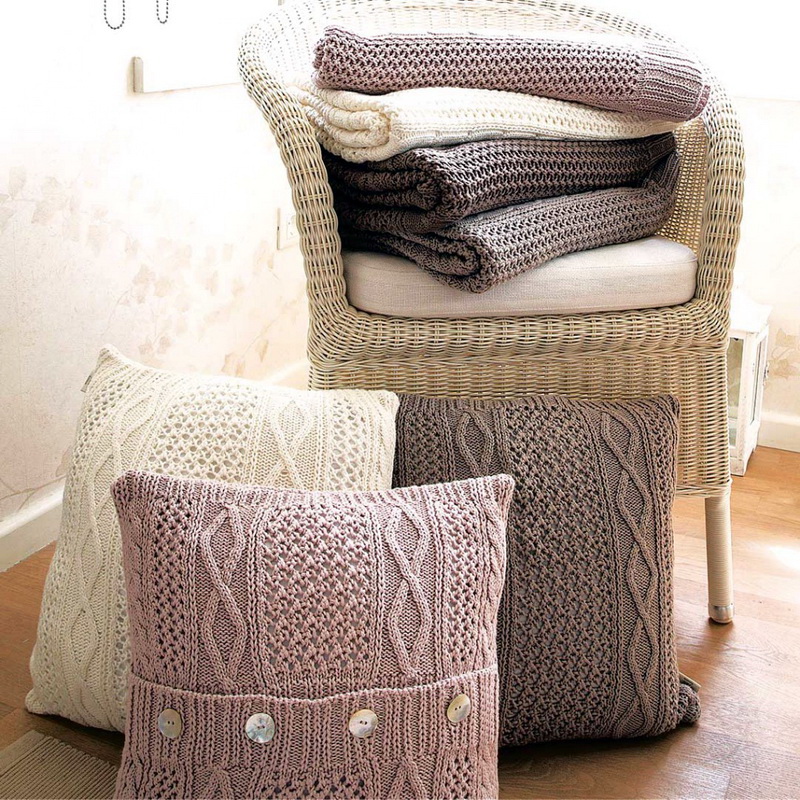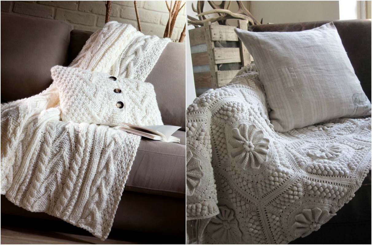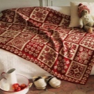 - Heute sind diese Umhänge die Dekoration von Polstermöbeln.Sie vervollständigen nicht nur, sondern unterstreichen die Idee des Designs und geben den Ton für das Innere vor. Sie können das Bett im Schlafzimmer mit einem Relief-Strick-Plaid dekorieren. Es fügt sich harmonisch in das Design des Raumes ein, wenn Sie das Thema des Gestricks durch dekorative Kissen unterstützen. Ein heller Teppich, eine Nachttischlampe, ein Muster aus einem Sofakissen in kirschroter Farbe beleben das Design.