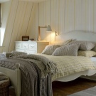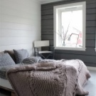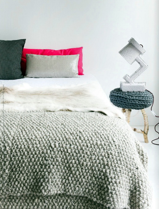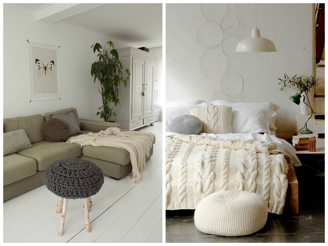 - Die Idee, ein Gestrick zu wiederholen, kann variiert werden: Milk Plaid mit großen Zöpfen sieht gut aus mit einem Kissen eines ähnlichen Stils und einem Hocker, aber ohne ein Bild. Die ausgewählte Farbe des Gestricks ermöglicht es Ihnen, das Erscheinungsbild eines Sets zu erstellen,und ein kleines Kissen in Form eines Mini-Puffs in Grau verleiht dem Farbschema des Raums Abwechslung und bewahrt den Stil vor einer Fülle von Lichtpunkten.