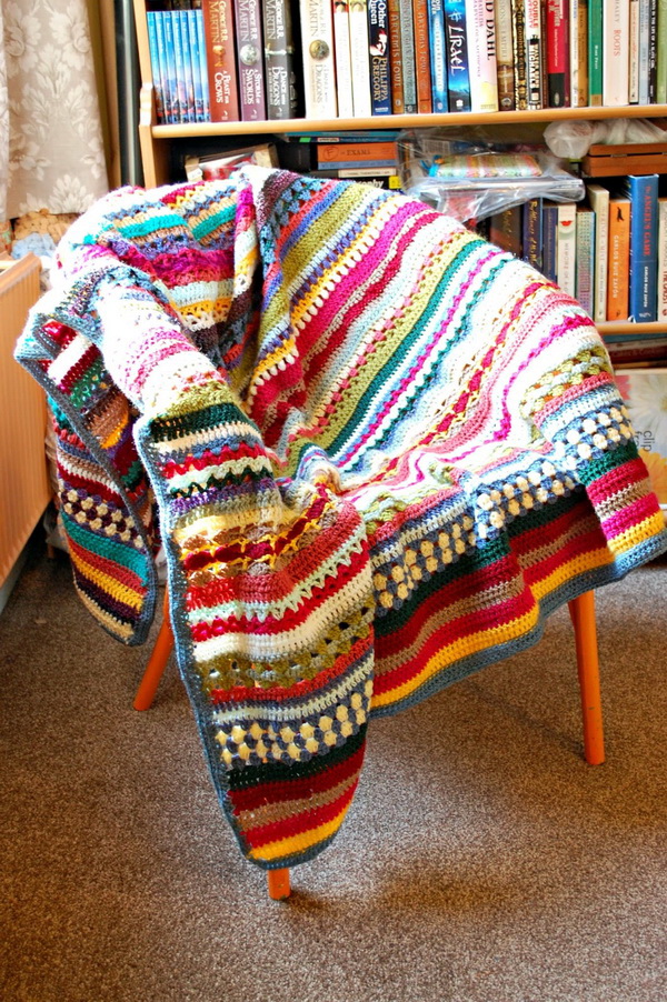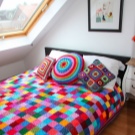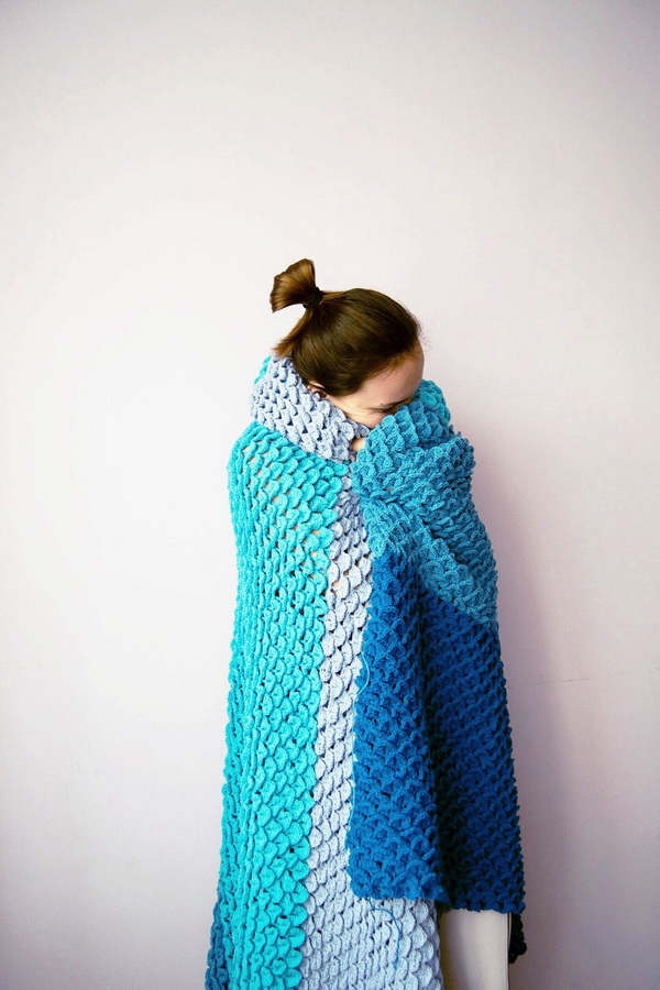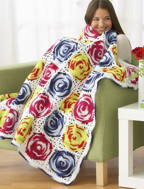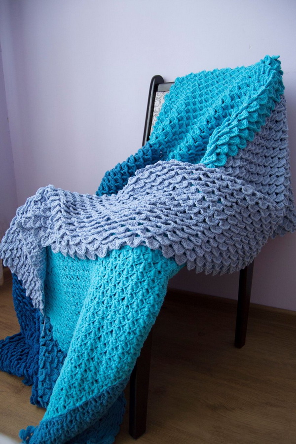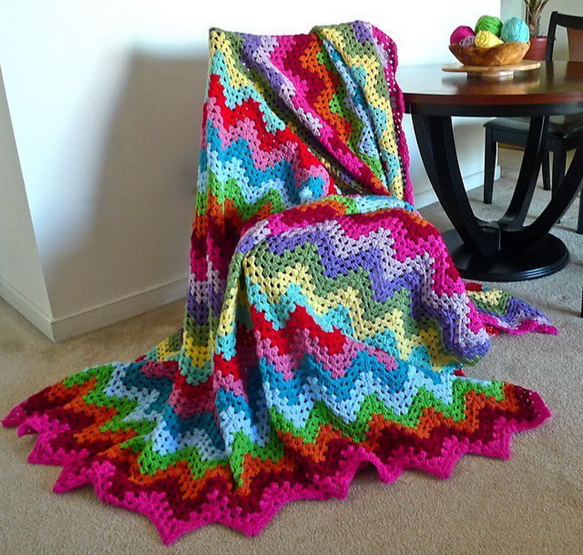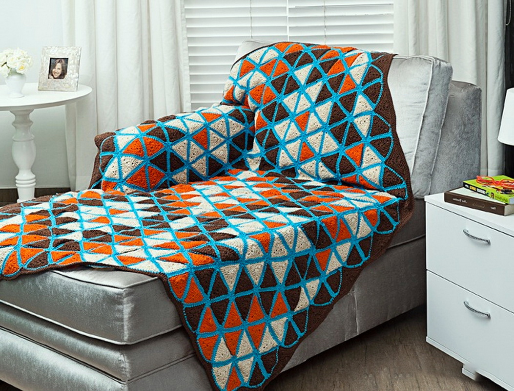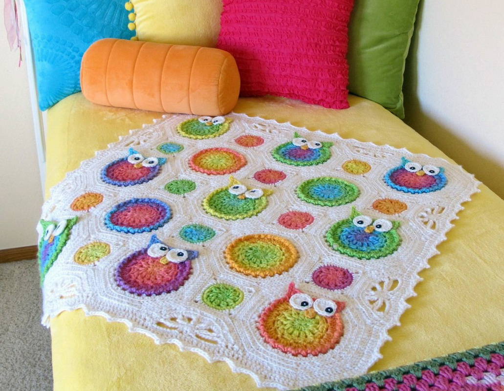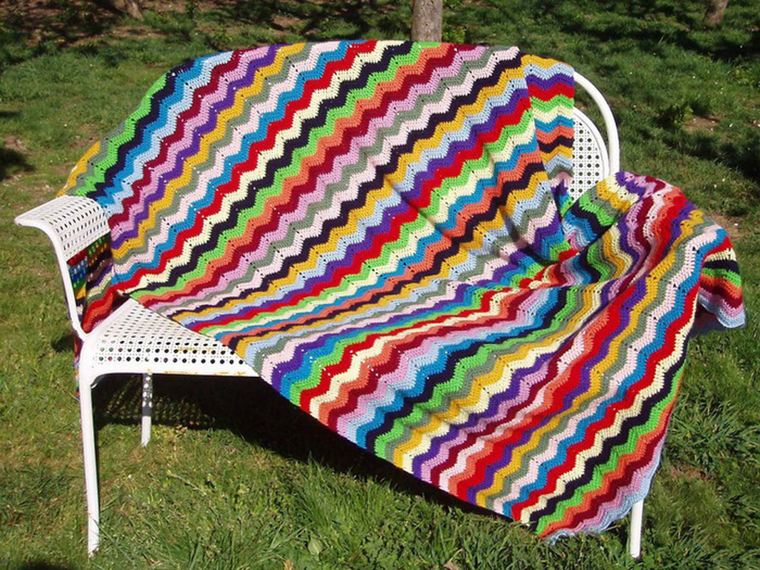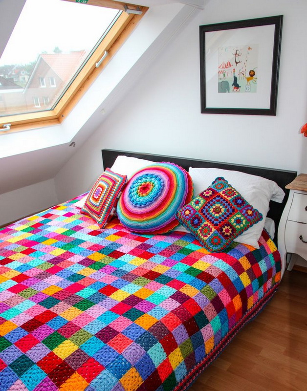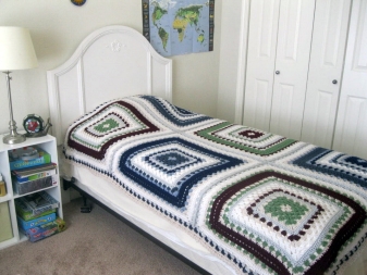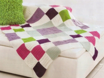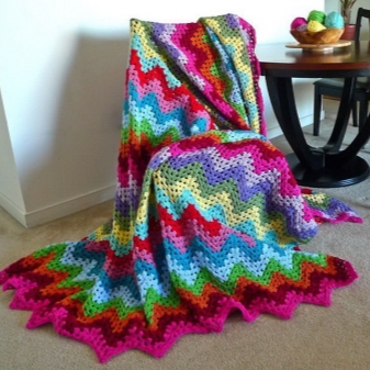 Gestrickte selbstgemachte Decken werden öfter in praktischen und gesättigten Farben ausgeführt.Die Favoriten der Farbpalette des Meisters sind grün, Terrakotta, Orange, Koralle, Karminrot, Melange (mehrfarbig von zwei oder drei Tönen) Farbe. Produkte für Kinder sind bunte Fröhlichkeit. Dies sind die interessantesten und hellsten Karos, die bei der Wahl der Farbe keine Grenzen haben.