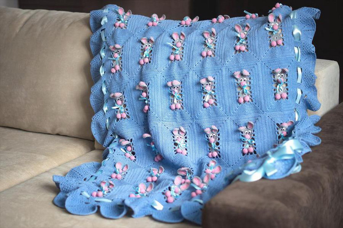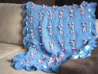 Dank des kreativen Ansatzes kann die gestrickte Decke eine besondere Form haben (mit Kapuze, Ohren, Knöpfen für die Verwandlung). Je nach Art der Produktion kann ein solches Produkt hergestellt werden: