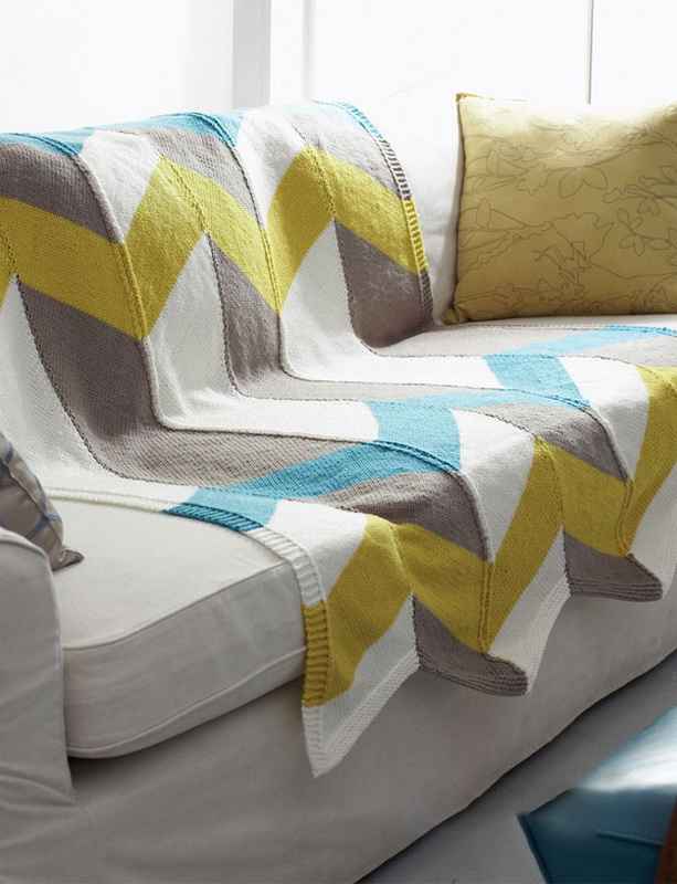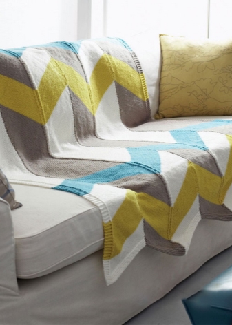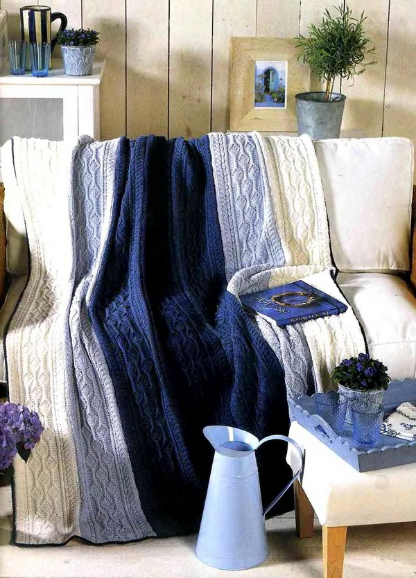 - Ursprünglich sieht gestrickte Decke mit Symmetrie in Form von breiten kontrastierenden Bändern aus. Dekoriert ein leichtes Sofa, wird es nicht nur ein stilvoller Akzent des Raumes, sondern auch ein praktischer Umhang: Durch Übergänge von hellen und dunklen Tönen ist es möglich, das Leben des Sofas und des Plaids selbst zu verlängern. Es ist leicht, Harmonie mit den verfügbaren Einrichtungsgegenständen zu schaffen: es lohnt sich, ein paar Blumentöpfe in der gleichen Farbe wie die Streifen zu setzen. Wenn sie nicht da sind, tun ein Bild, eine lebende Blume und sogar ein Serviertablett.