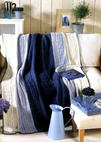 Besonders beliebte Verzierungen von Tüchern aus Strickplaids sind alle Arten von Zöpfen, Zöpfen, Geweben, Kombinationen von Streifen von abwechselnden Gesichts- und Linksschlingen.