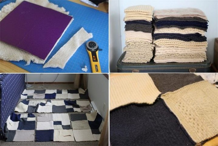 Eine der interessanten Techniken, um Plaid zu Hause zu machen, ist die Montage von Modellen aus alten Pullovern. In diesem Fall werden kleine Tücher in Quadrate geschnitten. Die Technik der Montage eines solchen Plaids erfordert eine Nähmaschine und ähnelt im Allgemeinen der Arbeit mit Patches in der Stärke von Patchwork. Gestrickte Fragmente der gleichen Länge und Breite werden zusammengenäht, wobei die Kanten an der Overlockung verarbeitet werden (so dass sie nicht auslaufen). Damit das Plaid "marktfähig" aussieht, ist es von der falschen Seite mit einem Futter aus Stoff oder Fell bezogen.