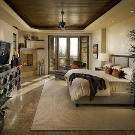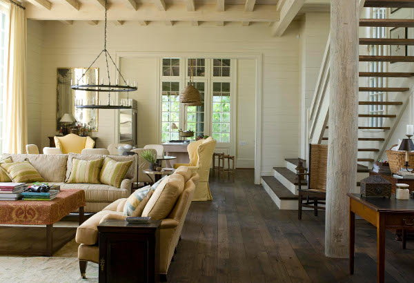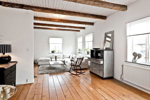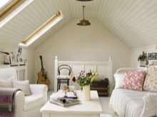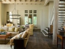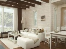 Wenn die Decke im Raum mit Schindeln verkleidet ist, können Sie massive Balken als Ergänzung verwenden. Es wird empfohlen, die Decke in helleren Farben zu streichen und dunklere zu strahlen. Dieser Farbkontrast lässt jeden Raum originell und sehr modern aussehen.Wie für die Kombination von Farben kann es weiß und braun, cremig Beige und schwarz sein.