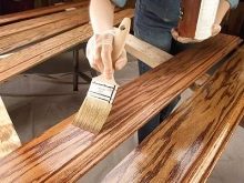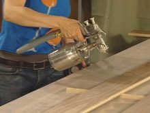 Wenn Sie das Färben nicht von Hand machen wollen, können Sie eine Spritzpistole oder einen Kompressor verwenden. Mit dieser Färbemethode kann man nur fertig werden, wer mit dieser Technik umgehen kann. In diesem Fall wird es möglich sein, eine gleichmäßige Schicht ohne Streifen und Tropfen zu erhalten. Natürlich ist diese automatische Methode schneller, aber die Farbe oder der Lack wird ein bisschen mehr als mit manueller Malerei nehmen.