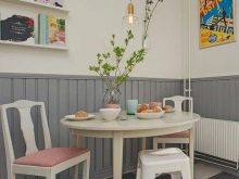 Eine solche Lösung ermöglicht eine visuelle Erweiterung des Raumes. Für die Küche und das Esszimmer müssen Sie helle Farbtöne wählen. Zum Beispiel kann es blau, pistazie, hellgrün oder beige sein. Übrigens harmonieren die Wände in Blau oder Pistazien perfekt mit den weißen Küchenmöbeln.