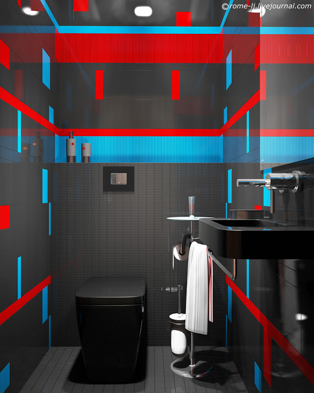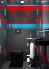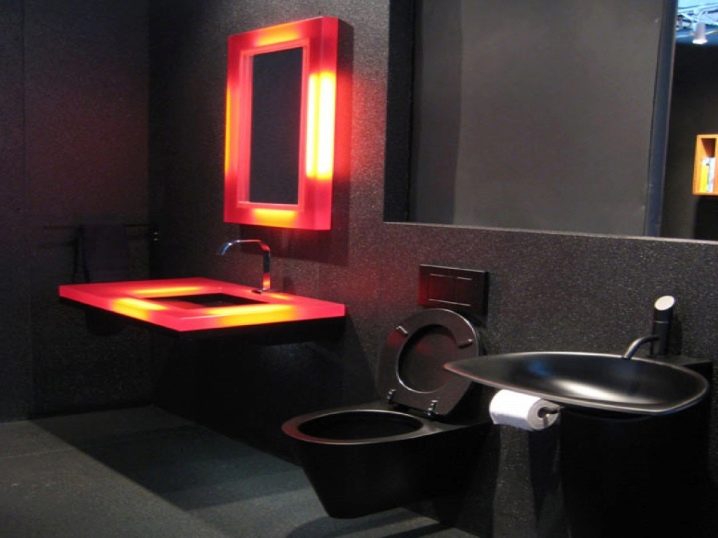 - Die schwarze Toilette ist in Harmonie mit den Sanitäranlagen, die mit rot-gelber Beleuchtung dekoriert sind. Eine solche Beleuchtung schafft eine besondere Atmosphäre im Badezimmer oder in der Toilette.